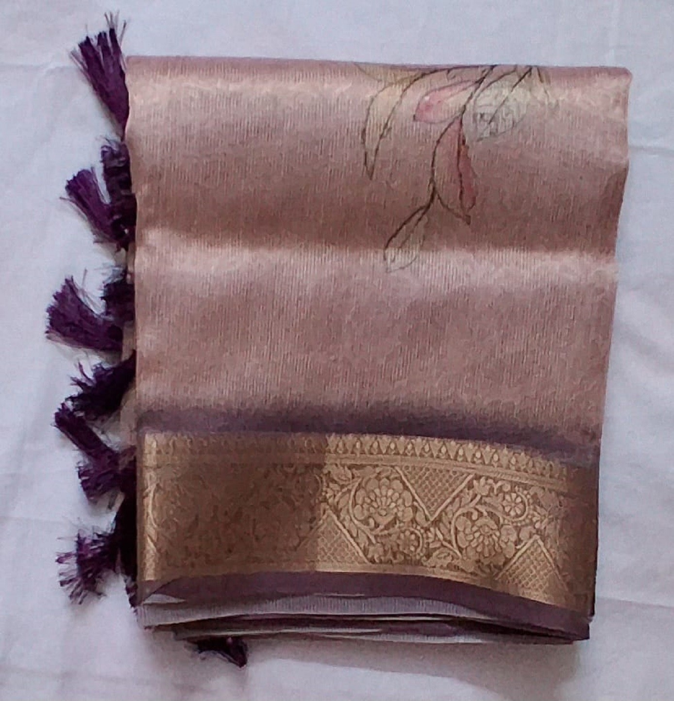 New Arrival: Experience the luxurious feel of our Artisan Tissue Saree. Beautiful Coffee Brown shade and intricate design. Full set with blouse.