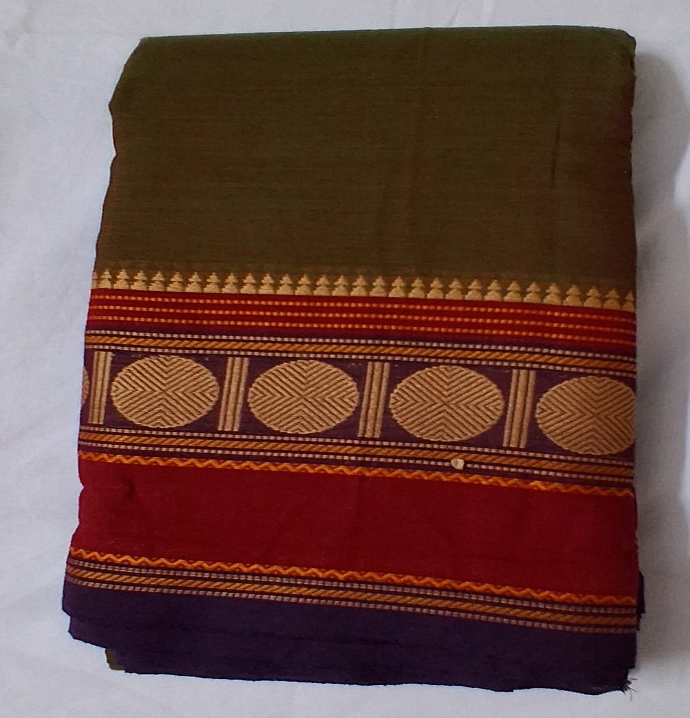 Experience breathable luxury Get the Olive Green Deluxe Pure Cotton Saree with a subtle plain border. Perfect for everyday and festive wear. VSK Home Market.
