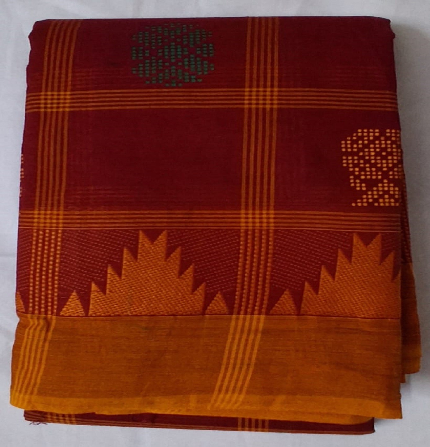 This saree is crafted from premium 100% pure cotton, ensuring maximum breathability and comfort for all day wear. The Dhakai weave style adds a rich, artisanal texture, while the checked pattern and traditional temple border showcase superior craftsmanship. The fabric is lightweight yet durable, offering a soft hand feel that softens further with every single wash.
