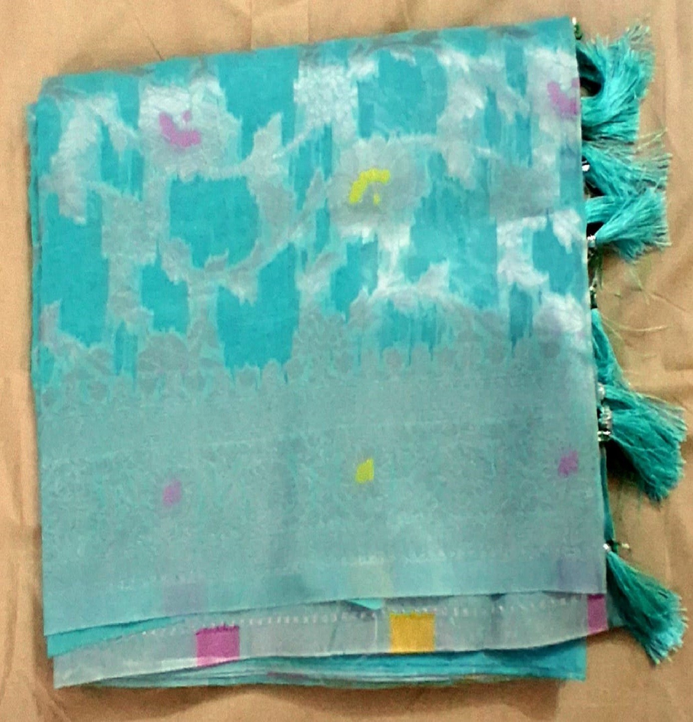 This exquisite saree is crafted from Premium Banarasi Silk, renowned for its rich texture and lustrous finish. The turquoise blue body features intricate Zari floral motifs, while the border showcases a traditional Meenakari-inspired design. Its unique quality lies in the hand-woven precision, offering a regal drape and timeless shine.