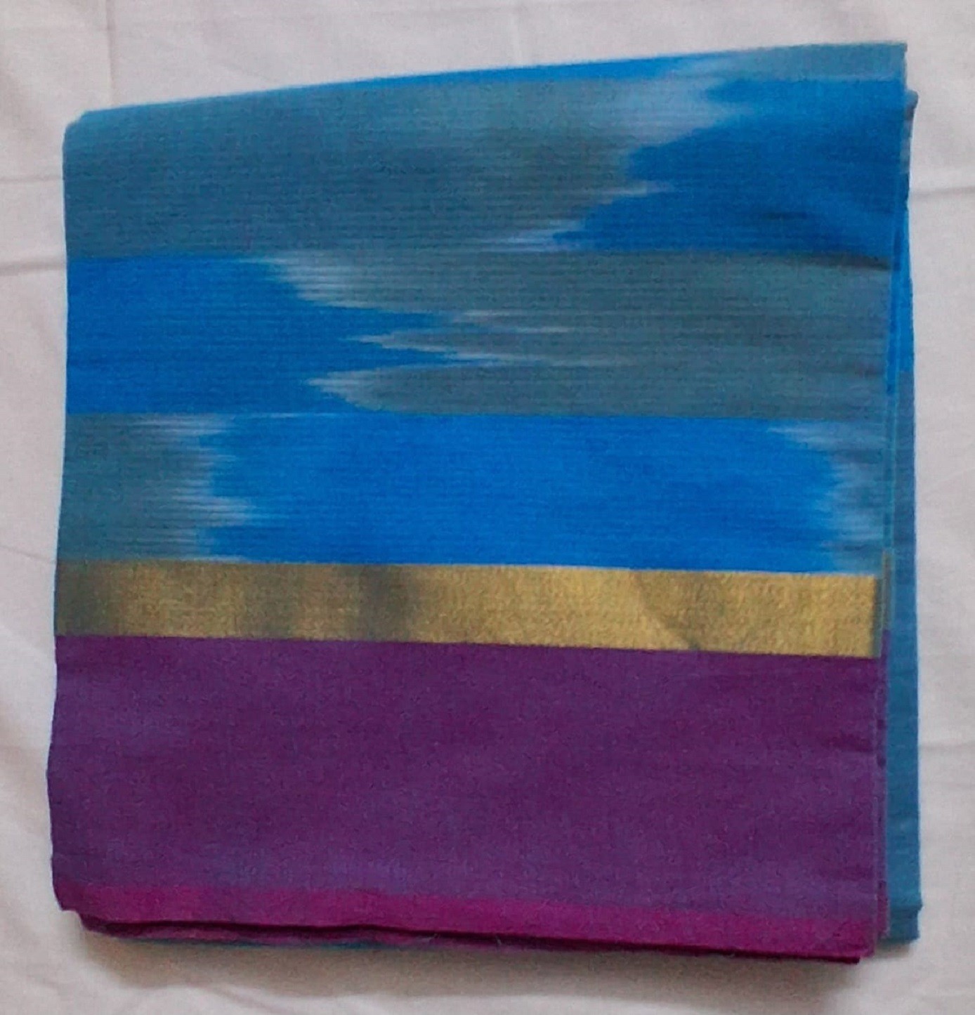 To maintain the integrity of the ikat design we recommend a gentle cold water hand wash with mild detergents. Avoid soaking the saree for long periods and dry it in a shaded area to prevent the blue hues from fading. Iron on a medium setting while the fabric is slightly damp to keep the cotton crisp and smooth. Proper storage in a cool dry place within a cotton bag will preserve the material quality and beauty for many years.