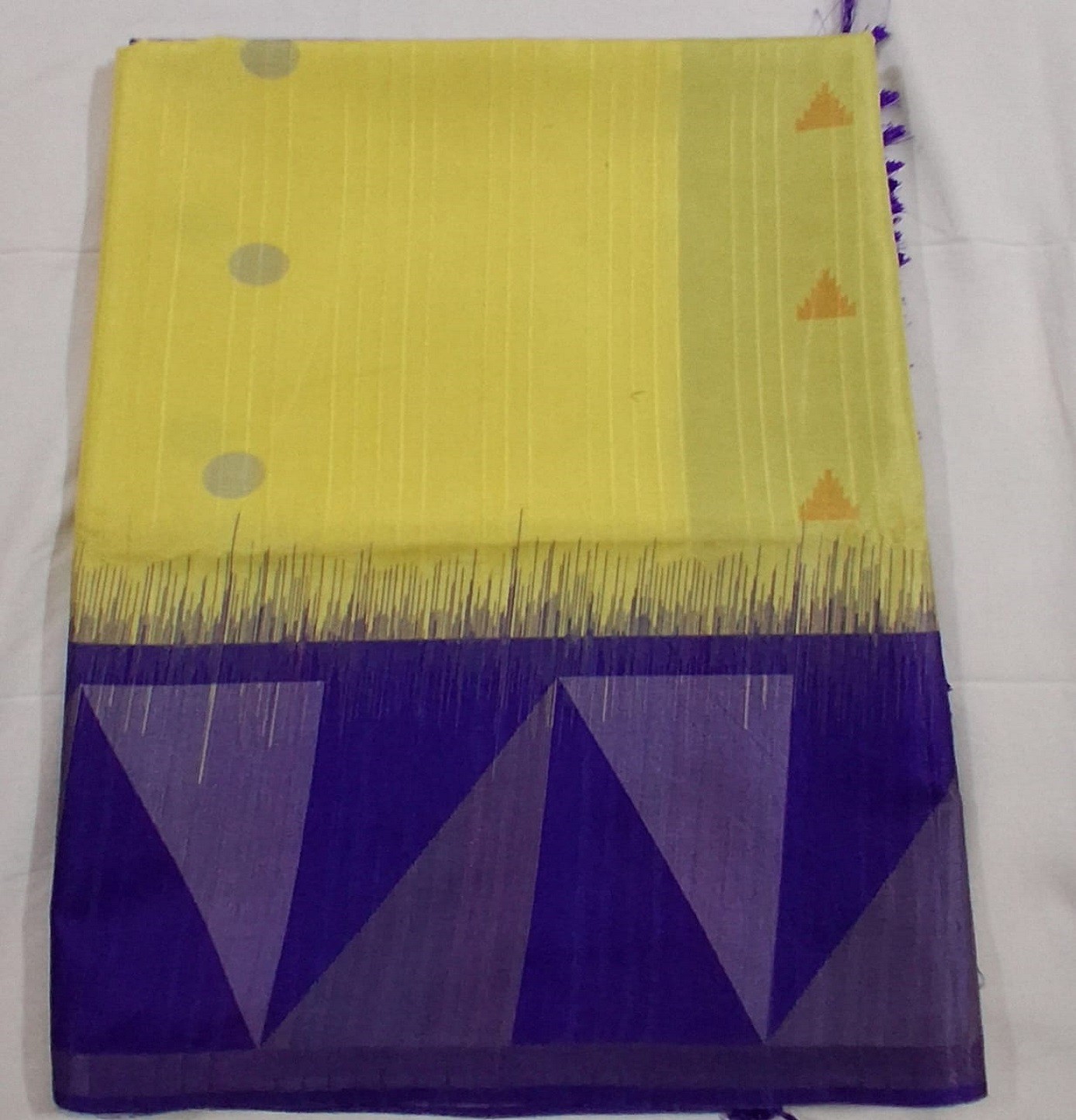 Drape yourself in sunshine This Regal Lemon Yellow Raw Silk Saree from VSK Home Market features a striking contrast border and comes complete with a matching