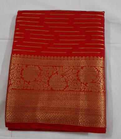 Elevate your style with this stunning Red Fancy Saree from VSK Home Market. Features intricate Regal Gold work. Complete set with a stitched blouse. Must have