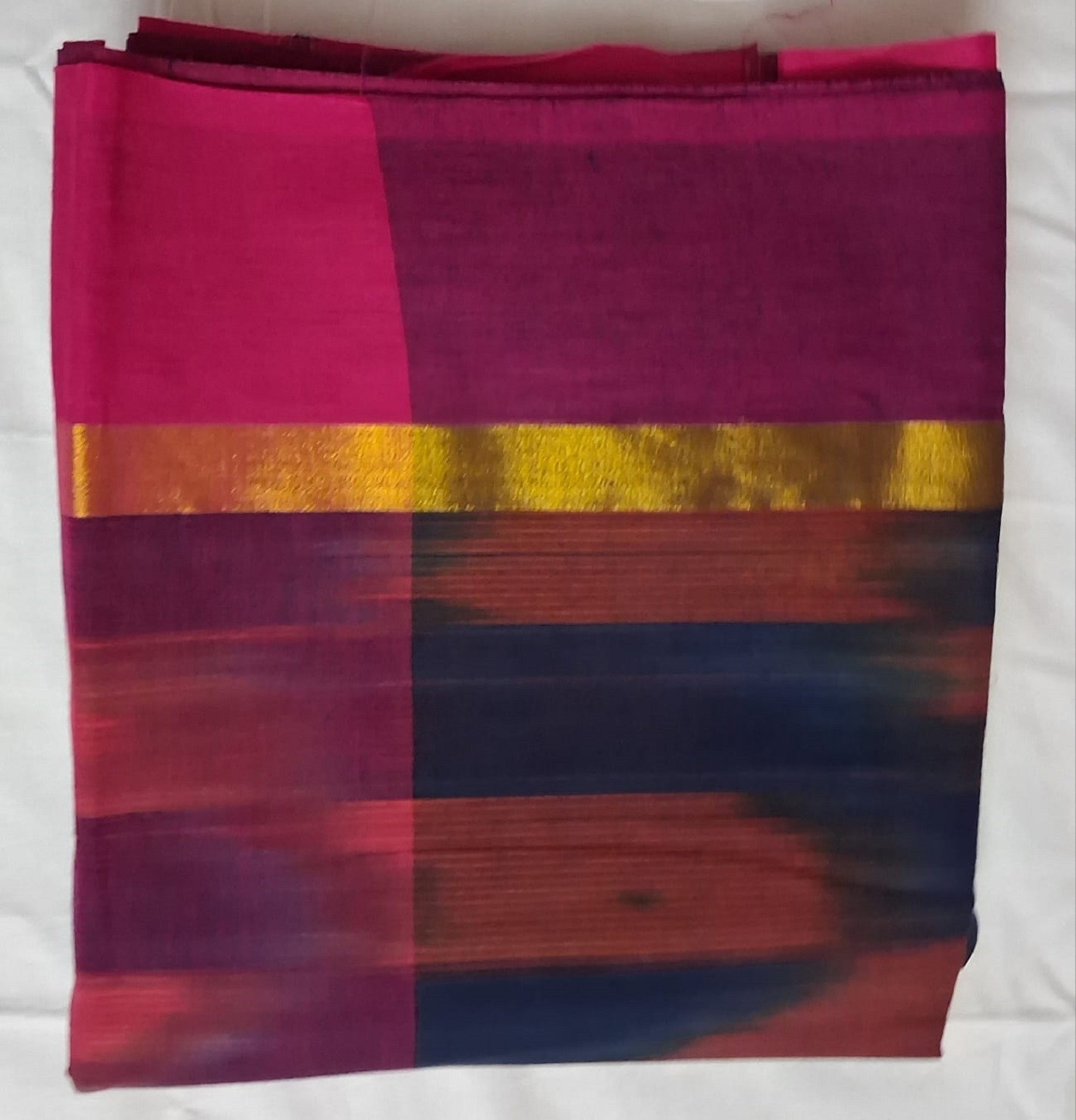 To maintain the vibrant blue hues and the delicate ikat geometry, we recommend a gentle cold water hand wash using a mild pH neutral detergent. Avoid soaking the fabric for extended periods and do not wring the material. Dry the saree in a shaded area away from direct sunlight to prevent color fading. Iron on a medium setting while the fabric is slightly damp to keep the cotton crisp and preserve the integrity of the weave.