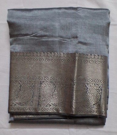 To maintain the structural integrity and the vibrant grey hue of the fabric, we recommend professional dry cleaning for the first few washes. For home care, use a very mild detergent in cold water and avoid soaking the saree for extended periods. Always dry the garment in a shaded area away from direct sunlight to prevent the big border from losing its shine. Iron on a medium setting while the fabric is slightly damp.