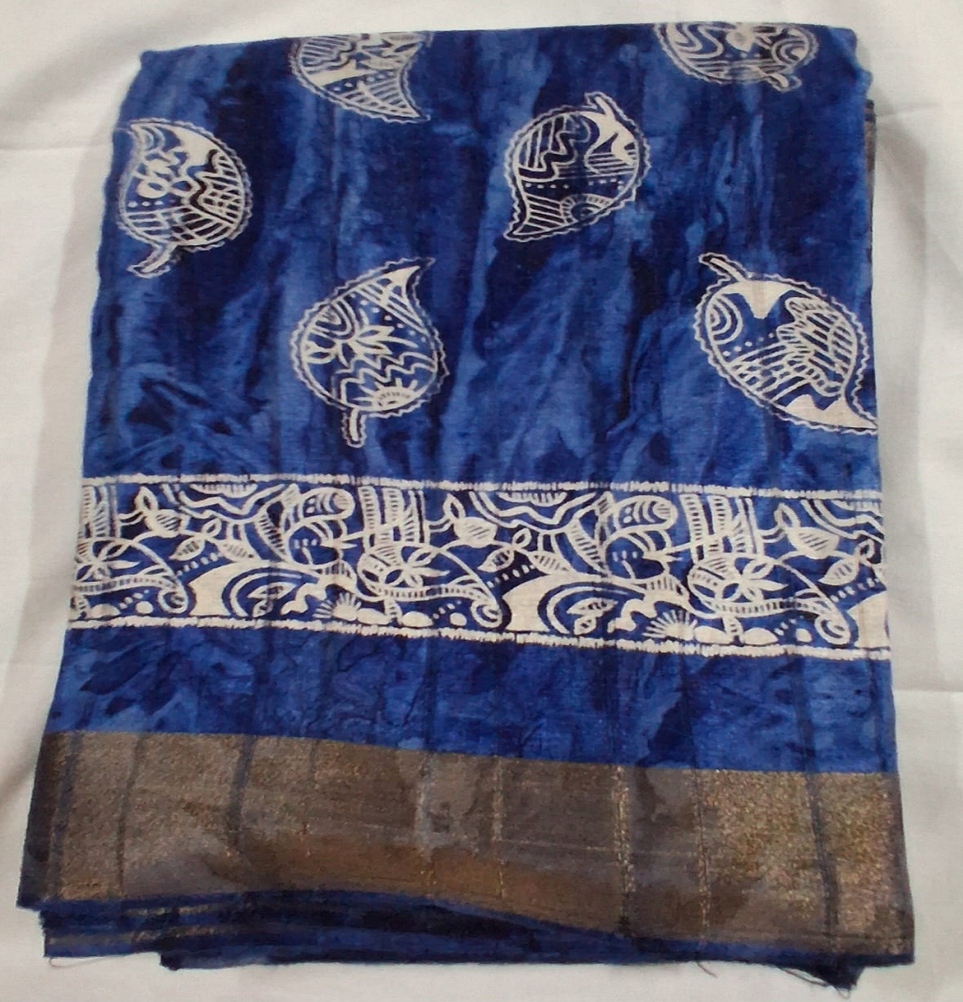 Elevate your style with a Supreme Golden Brocade Raw Silk Saree. Stunning blue color, intricate brocade design, and matching blouse. Exclusive to VSK Home