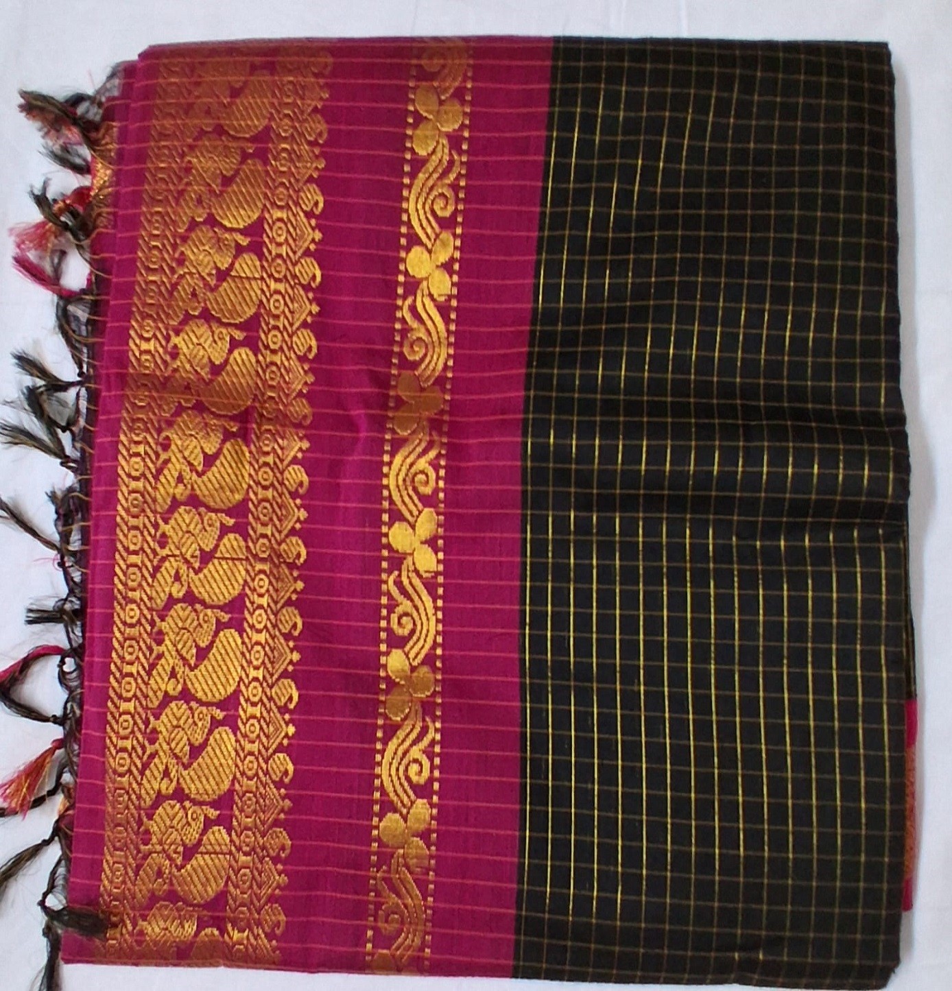 Classic style meets comfort. Shop the Black Colour Checks Supreme Kalyani Semi Cotton Saree from VSK Home Market. Lightweight, elegant, and comes complete with